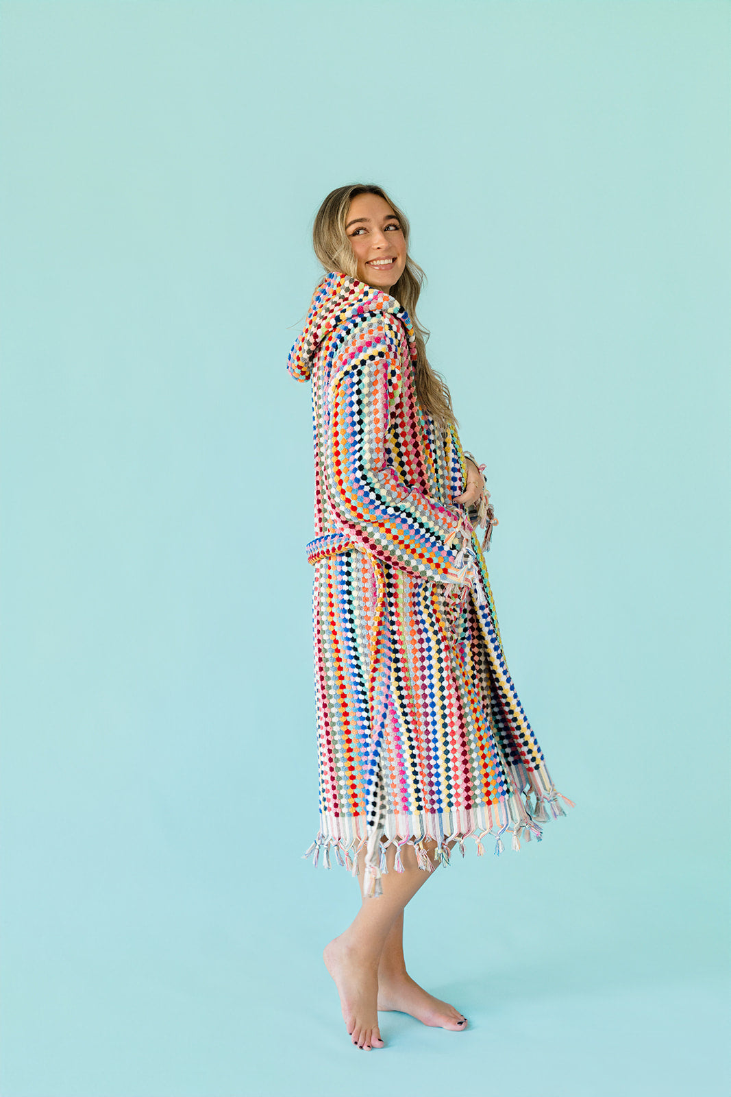 Embrace the beauty of sustainable craftsmanship with our vibrant Rainbow Pom Pom Bathrobe – where every piece tells its own colorful story.