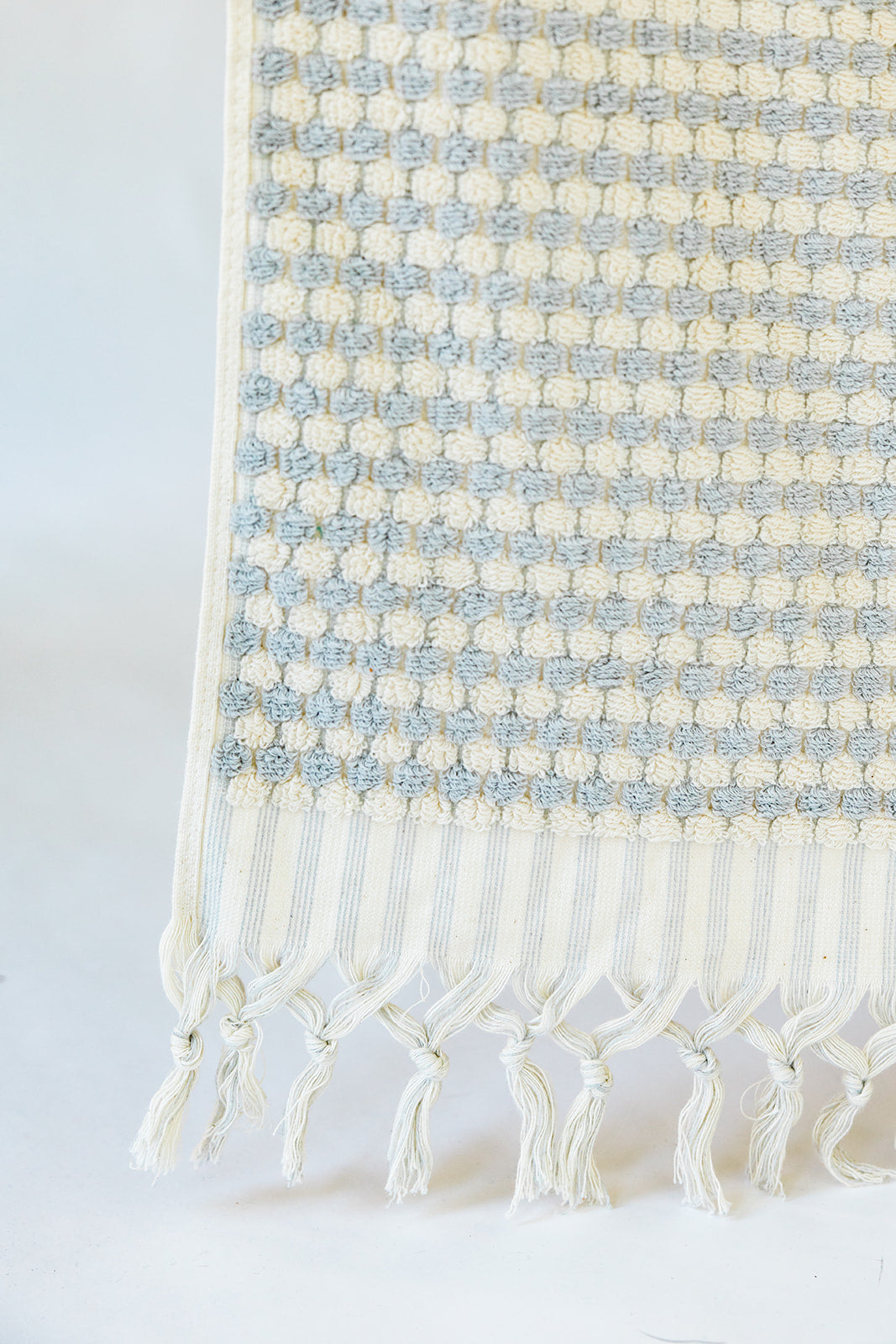 This large Turkish Towel or throw blanket comes in a Baby Blue and Cream Pom Pom pattern made out of terry cloth. Its versatility makes it a nice piece for the bathroom, bedroom, or your favorite chair. It's the perfect throw blanket for bonfires and picnics too!
